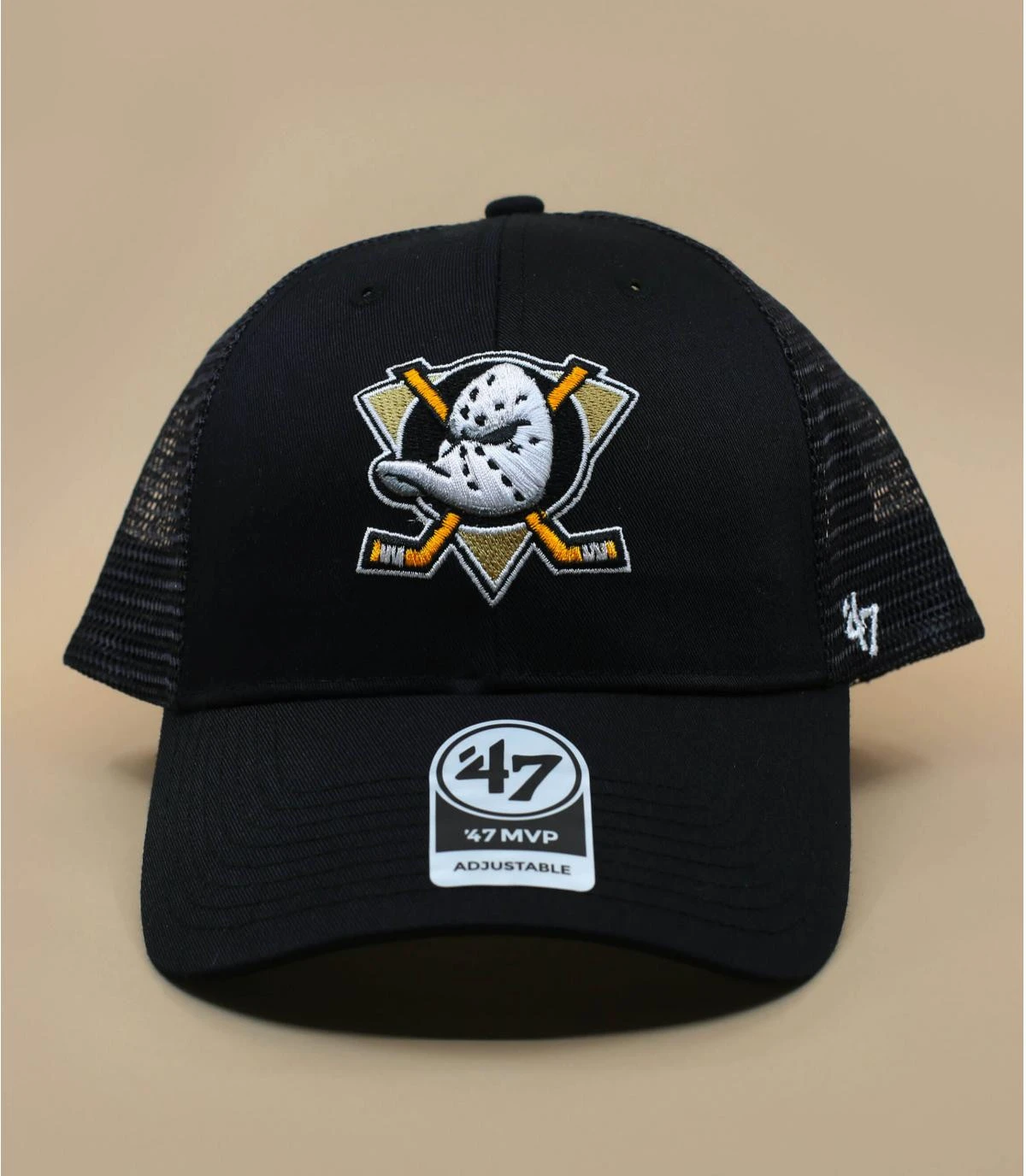 Casquette trucker Ducks noire et blanche par la marque 47 brand. Logo de l’équipe devant, système de serrage au dos. Modèle en coton.