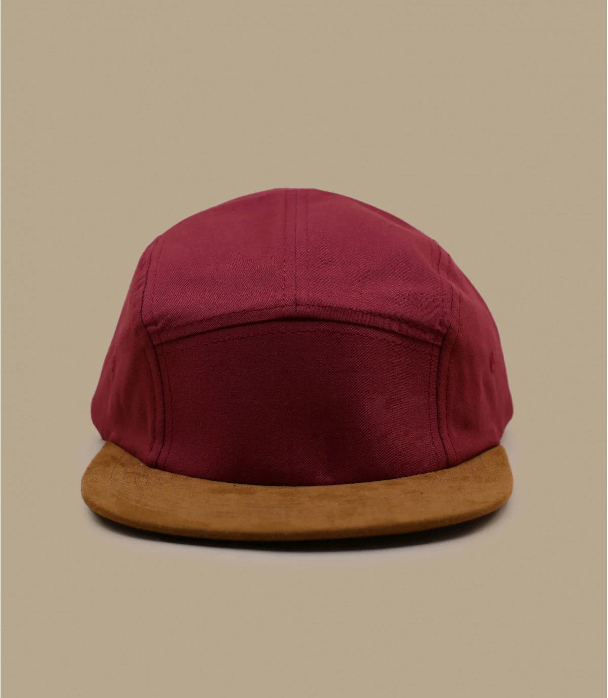 5 Panel bordeaux en coton washed avec visière suede marron. Attache rĂ©glable avec clip Ă l’arrière. Tour de tĂŞte 55-60 cm.