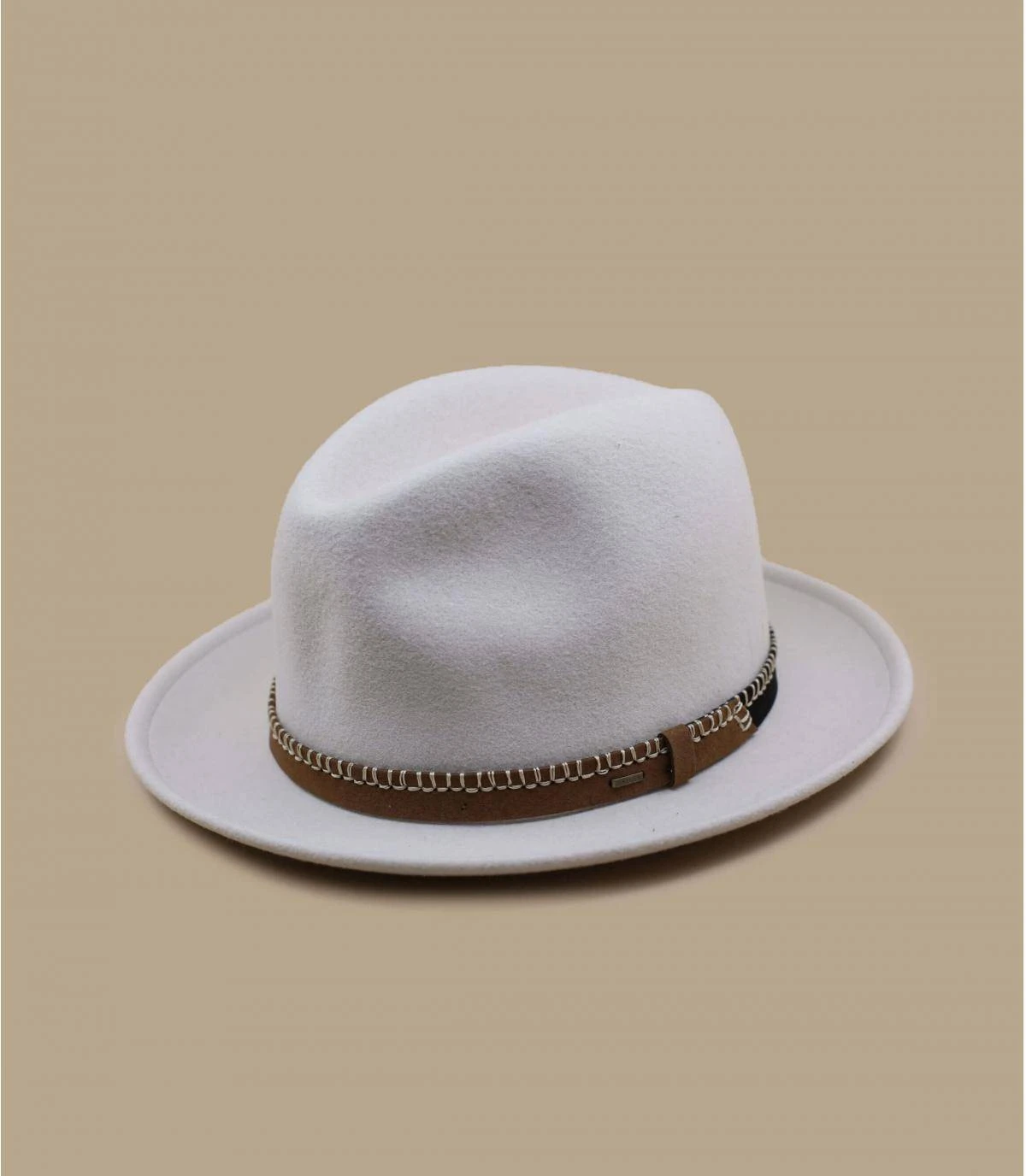 ConfectionnĂ© aux Ătats-Unis en feutre de laine LitefeltÂź dĂ©perlant qui conserve mieux sa forme, ce magnifique chapeau Ă©cru est relevĂ© dâune bande de cuir suĂ©dĂ© avec un dĂ©tail brodĂ©.