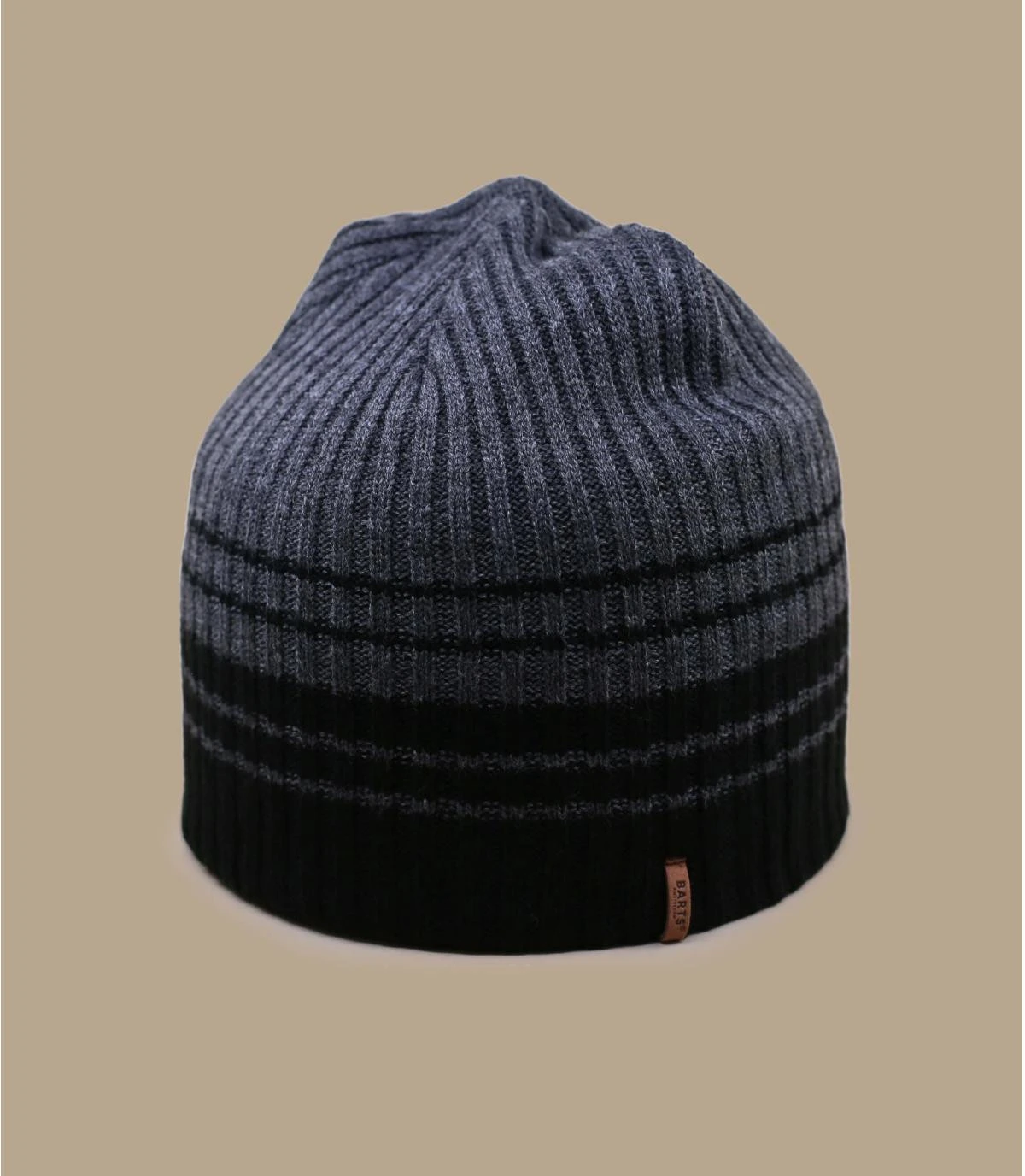 Ce bonnet noir et gris avec des rayures sera très seyant autant à la ville qu’en pleine nature. Il a été tricoté avec la fibre Polyana, alternative à l’acrylique qui consomme moins d’eau et émet moins de CO2.