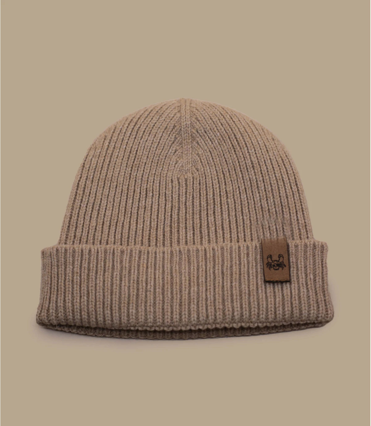 Bonnet en laine fabriquĂ© en France dans la rĂ©gion Rhone Alpes et personnalisĂ© dans notre Atelier d’Annecy, Ă partir de matières recyclĂ©es. Crabe pirate gravĂ© sur patch marron.