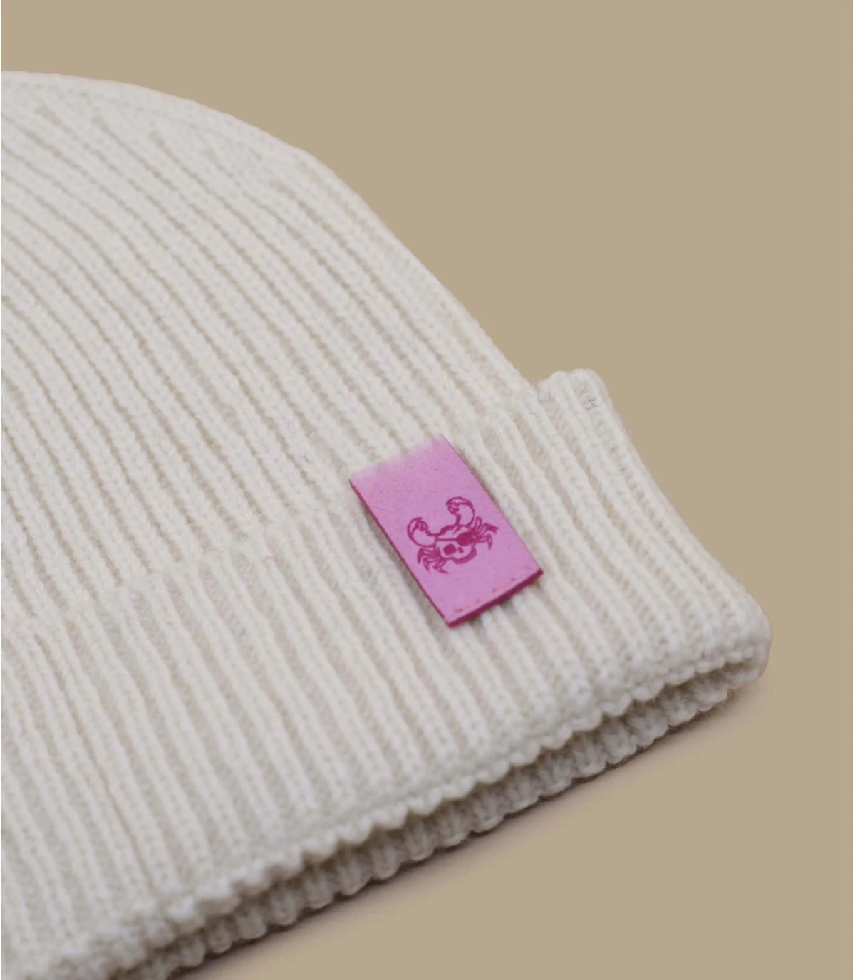 Bonnet en laine fabriquĂ© en France dans la rĂ©gion Rhone Alpes et personnalisĂ© dans notre Atelier d’Annecy, Ă partir de matières recyclĂ©es. Crabe pirate gravĂ© sur patch rose.