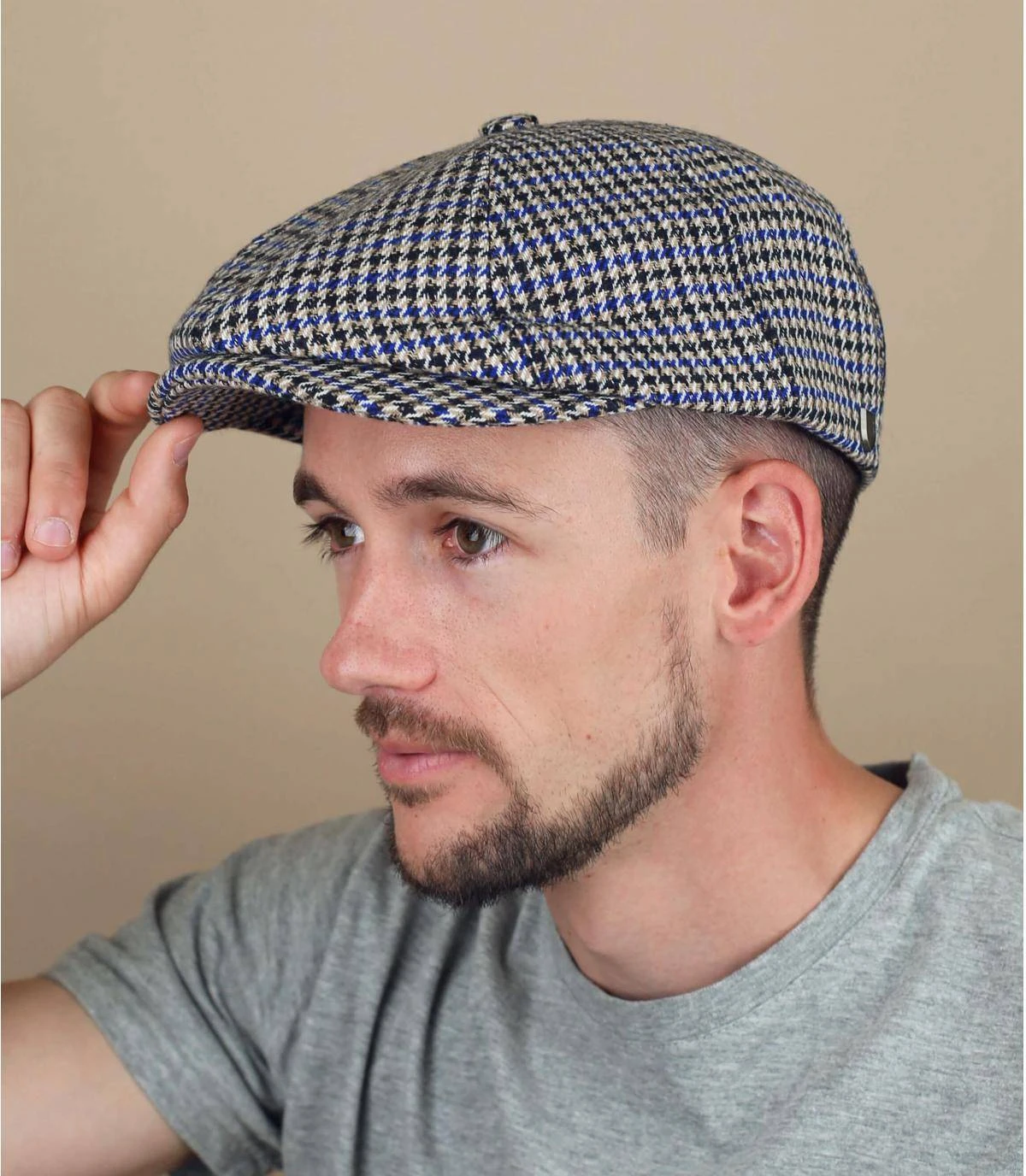 Cette superbe casquette gavroche de la marque californienne Brixton présente un imprimé à pied de poule dans des tons kaki et bleus au style élégant et délicieusement rétro.