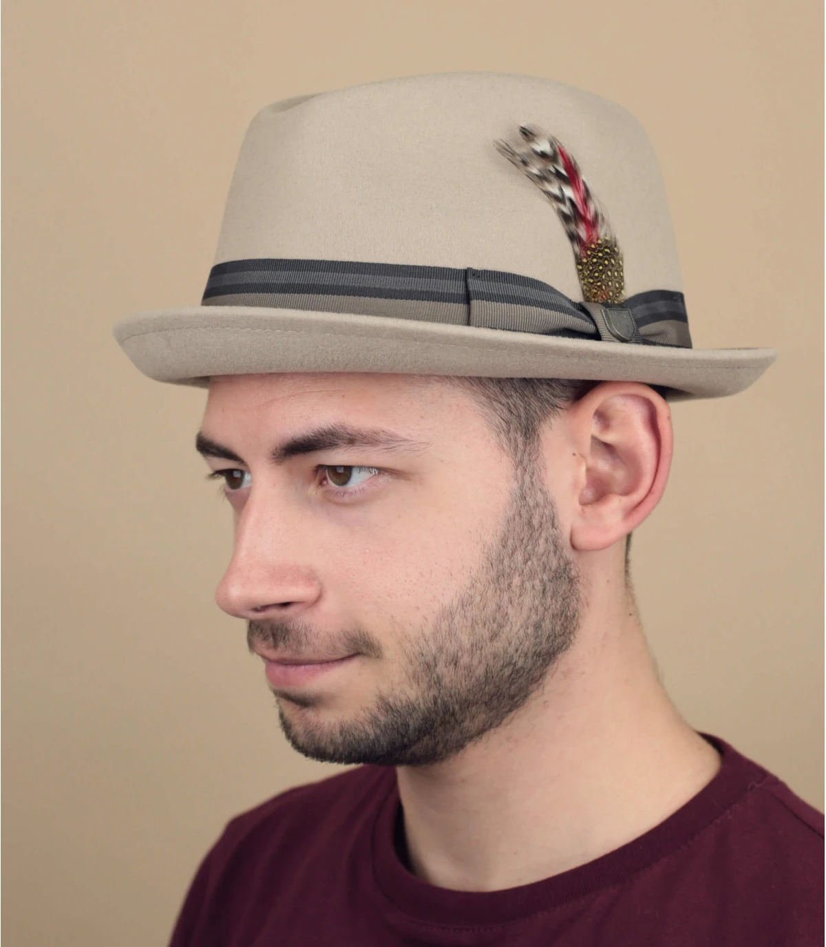De coloris beige clair, ce chapeau est lâaccessoire ultime pour complĂ©ter votre tenue rĂ©tro ou branchĂ©e. Il peut vous protĂ©ger de la pluie et du vent. Le bandeau colorĂ© et la plume sont trĂšs chics.