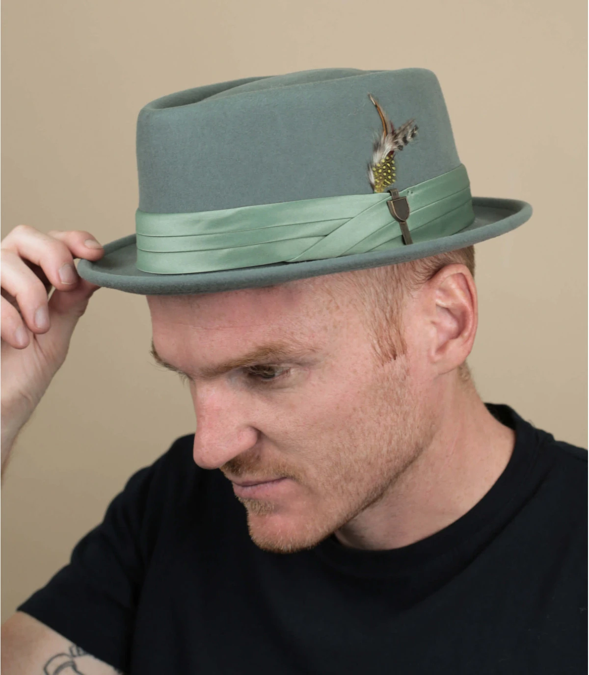 Ce chapeau pork pie vous donnera une classe inimitable grĂące Ă son coloris vert, et son allure jazzy qui date des annĂ©es 30. Une plume a Ă©tĂ© ajoutĂ©e sur un bandeau de mĂȘme couleur pour un maximum dâeffet.