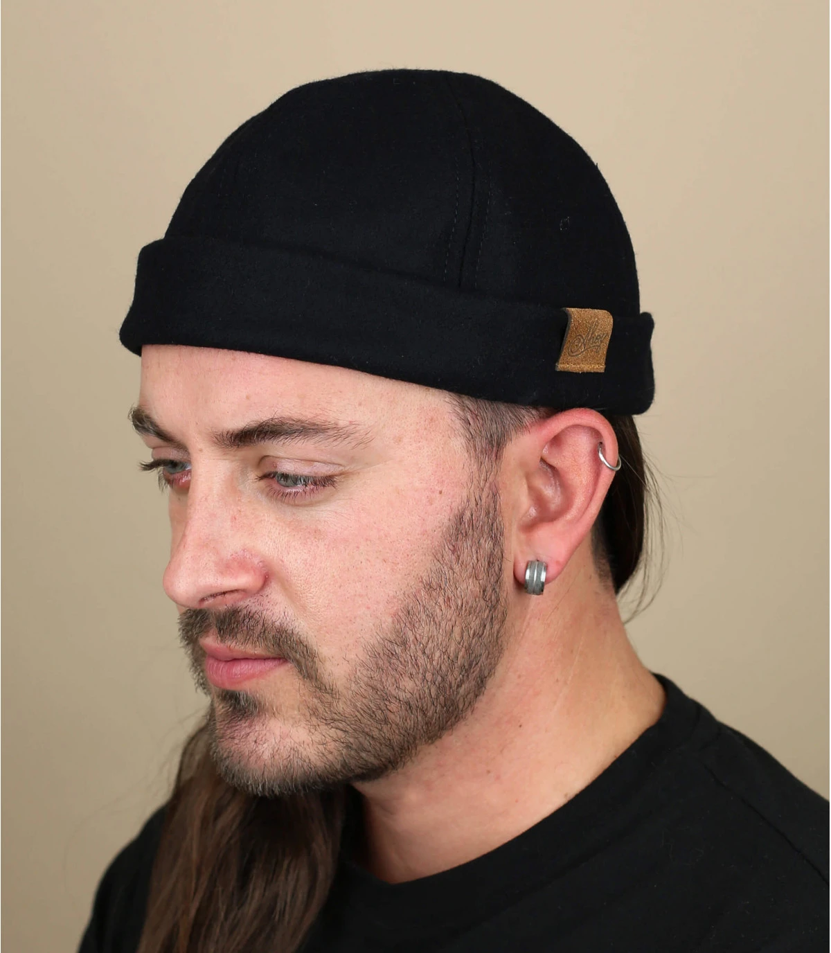 Laissez le vent du large souffler sur vos tenues de ville, avec ce bonnet docker bleu marine, confectionné dans une matière douce et chaude à base de laine. Il est relevé sur le côté d’un petit patch en cuir, gravé de la salutation nautique « Ahoy ».