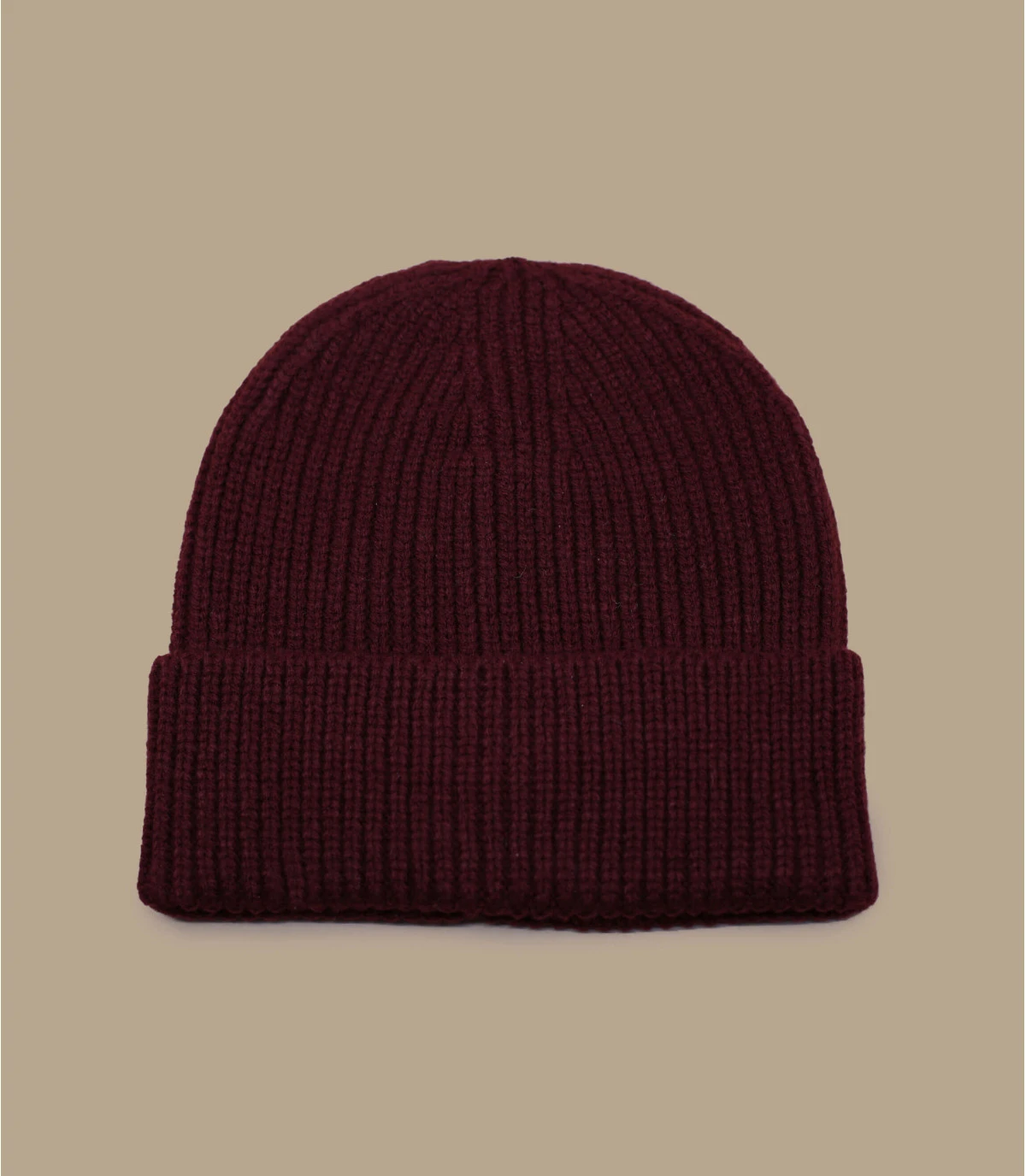 Bonnet revers en maille acrylique de couleur bordeaux. Taille unique : 55-60 cm de tour de tĂŞte.
