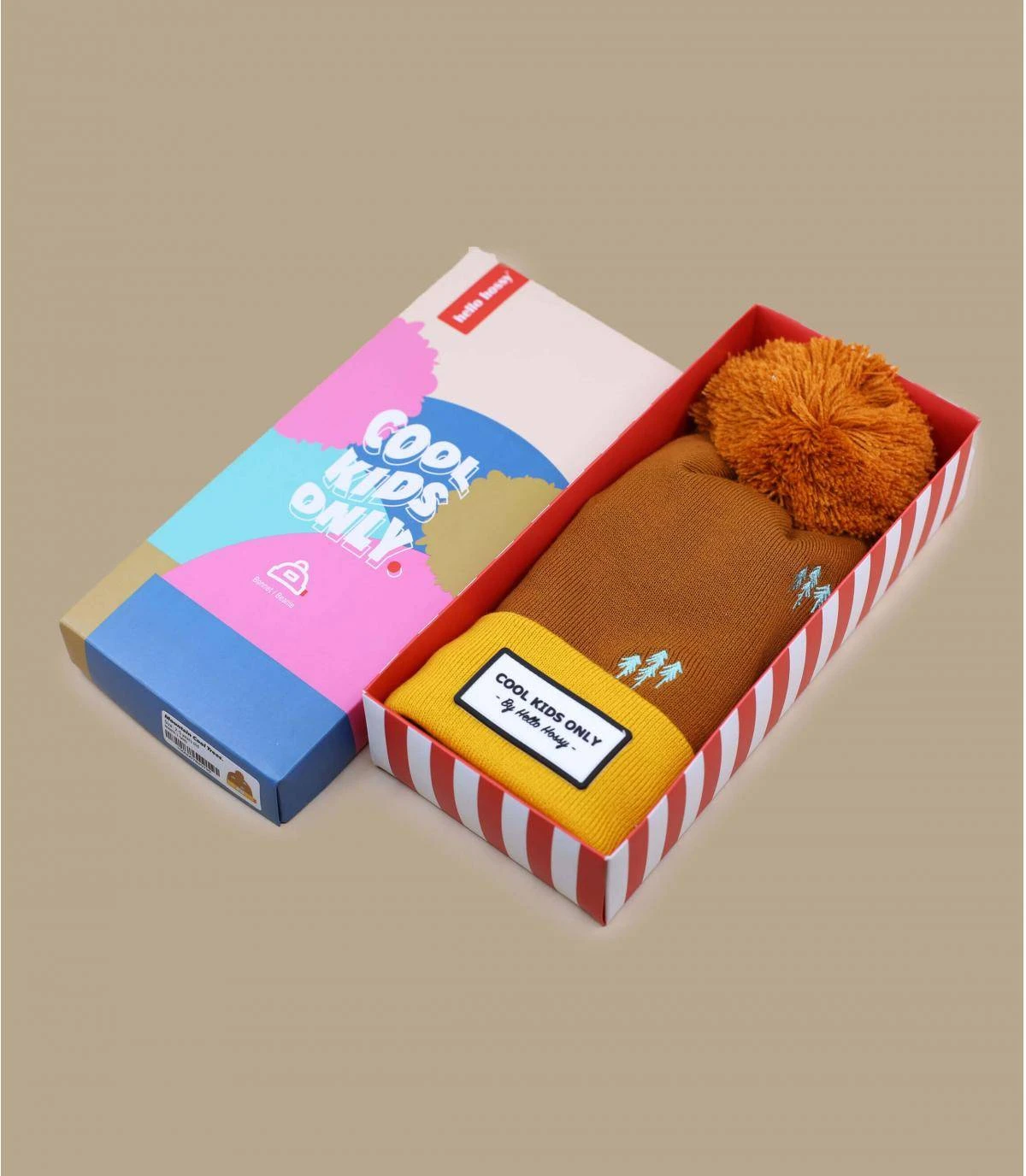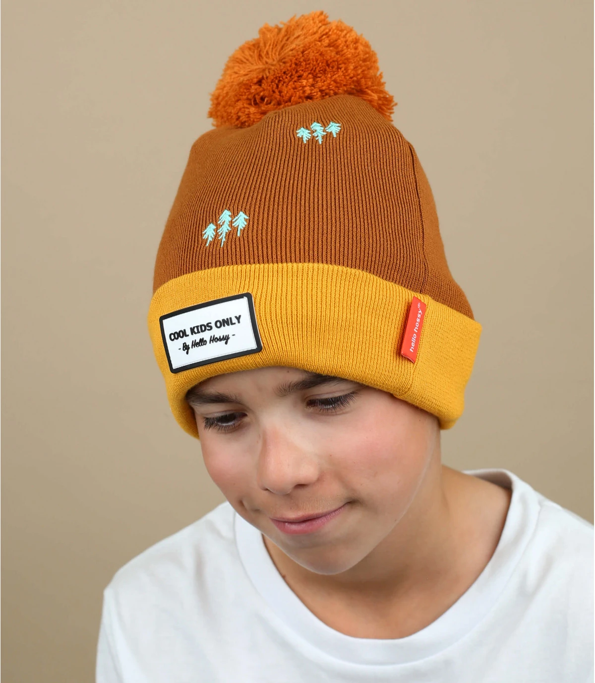 Composé de coton bio mélangé, ce charmant bonnet pour enfant marron à revers orangé est brodé de sapins pour un esprit très nature !