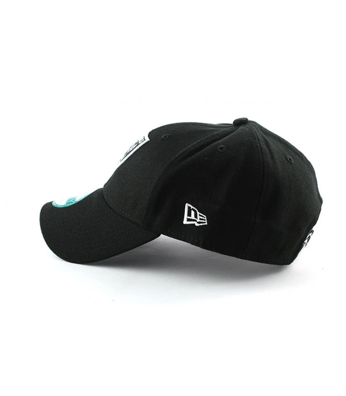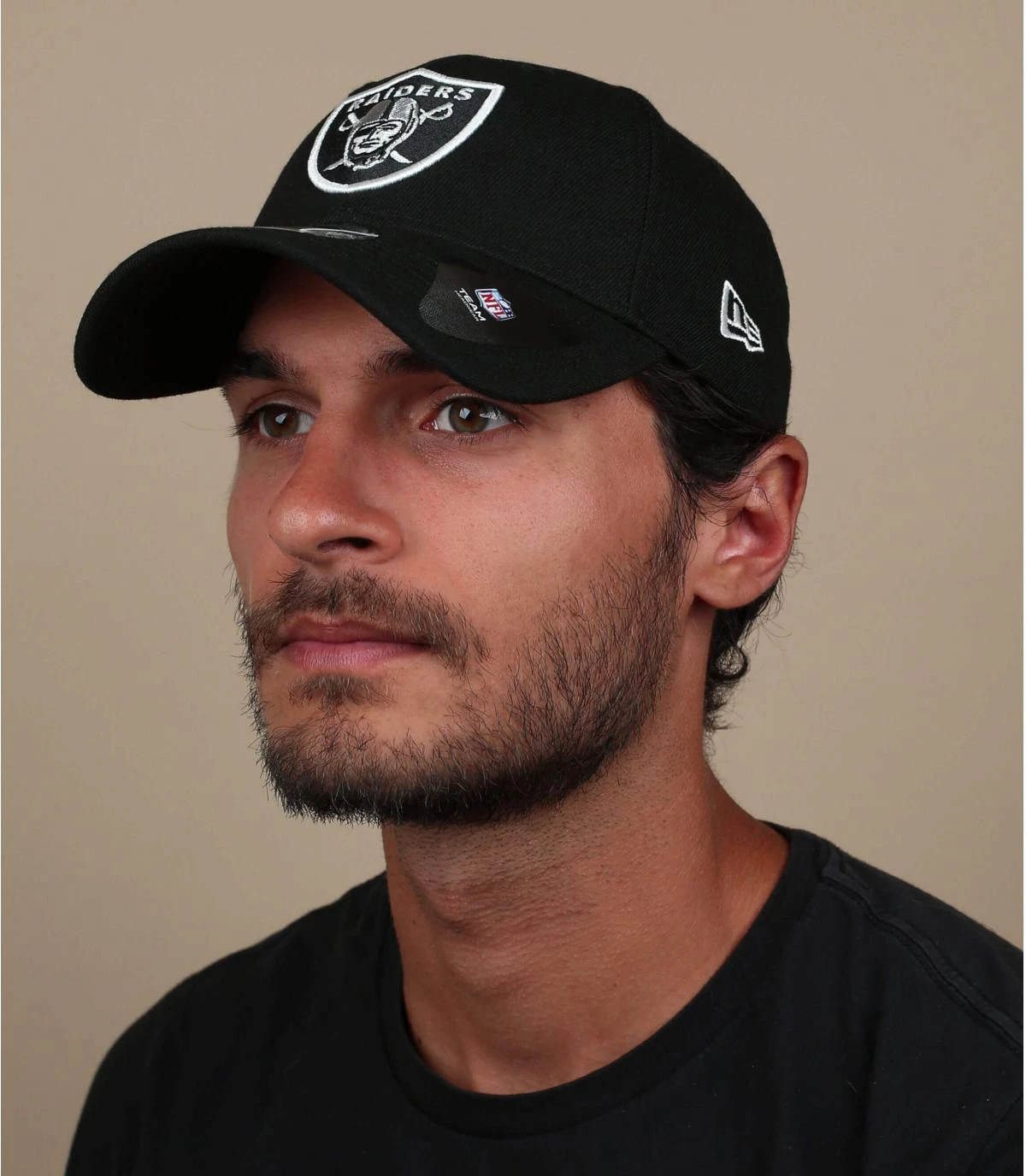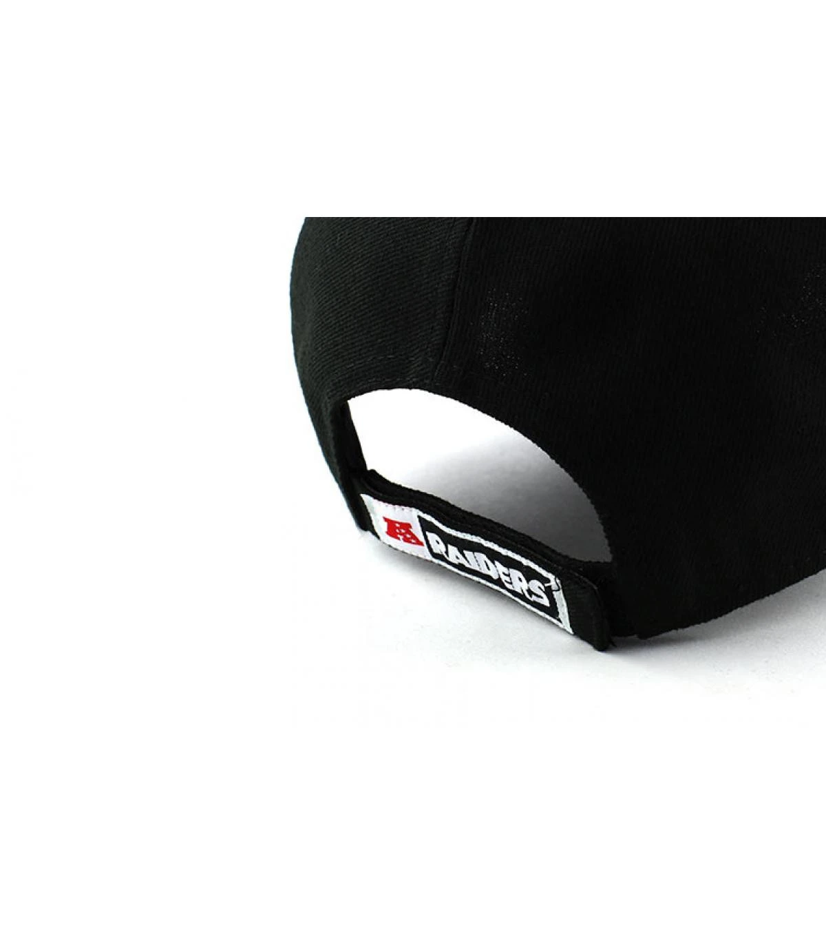 Casquette Ă visière courbĂ©e aux couleurs de l’Ă©quipe de football amĂ©ricain de la ville d’Oakland en Californie : les Raiders. Le logo de l’Ă©quipe en question est brodĂ© Ă l’avant de la casquette.