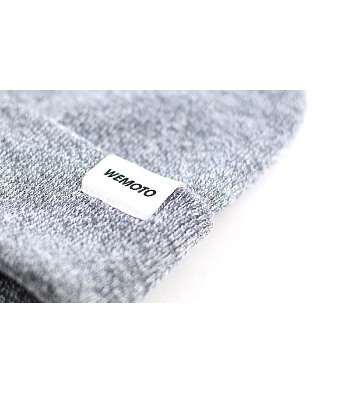 Bonnet à revers de chez Wemoto en gris chiné avec le petit patch cousu le le haut du revers qui fait toute la différence !