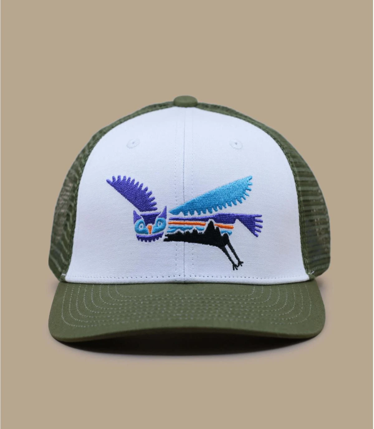 Offrez-lui une casquette trucker inspirée de la nature ! Cette casquette est réglable et adaptée pour les enfants. Elle arbore un motif d’oiseau sur le front violet et bleu. La visière et le filet mesh arrière sont de couleur verte.