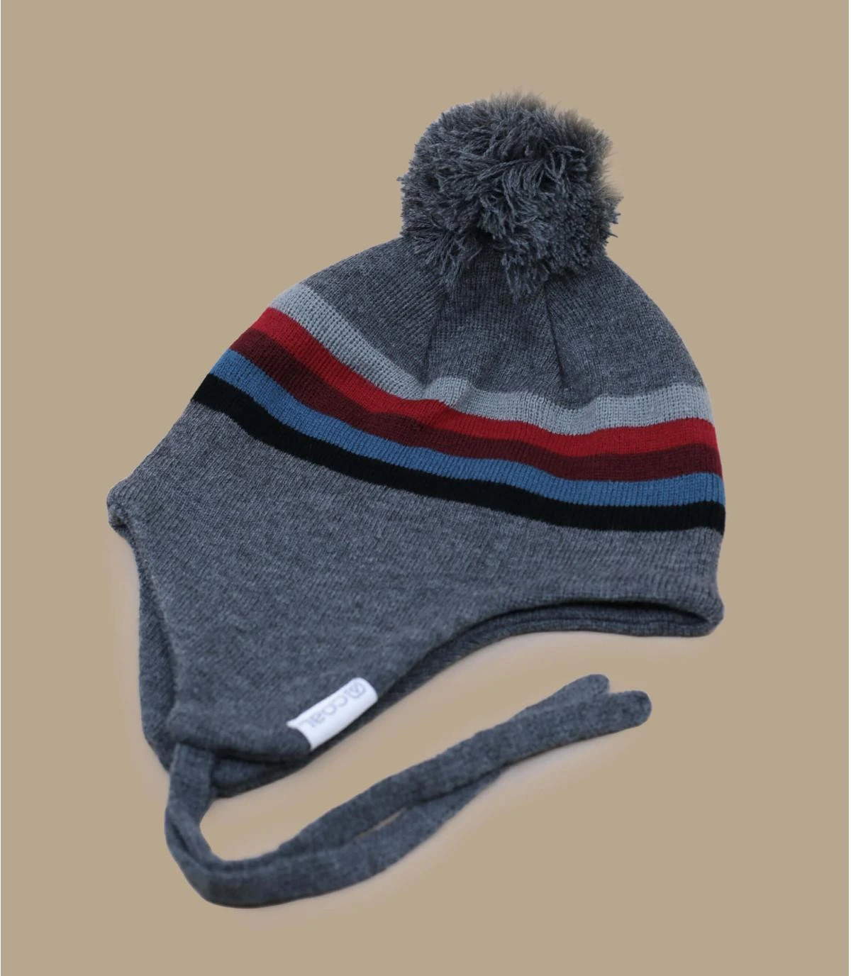 Portez ce bonnet hybride de style péruvien qui est à la fois un bonnet classique avec un pompon détachable et aussi un cache-oreilles muni d’un cordon d’attache. Son coloris est gris avec des bandes de couleur rouge et bleu.