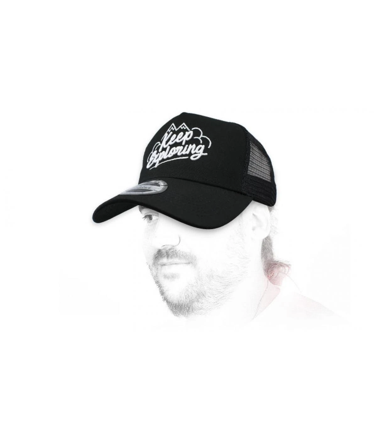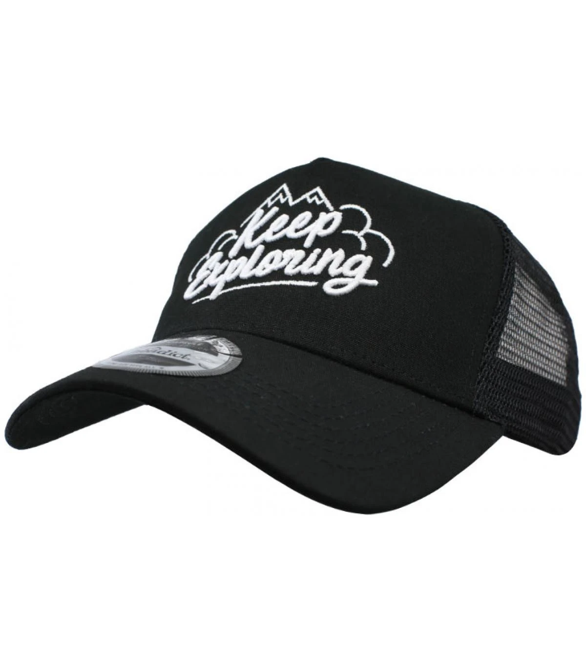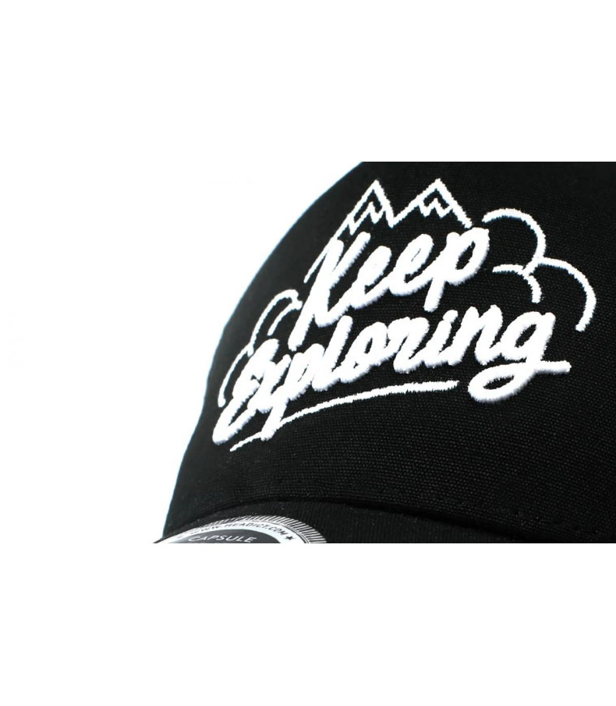 Parce que la vie est faite pour profiter de cette merveilleuse planète qui nous accueille, Keep exploring, gardez l’esprit ouvert et l’envie de découvrir et faites le savoir, avec cette superbe casquette noire a visière courbée. Elle est décorée devant d’une belle broderie sur fond de montagnes.