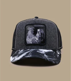 Entrez dans le poulailler avec cette casquette trucker noire originale ! Elle porte un imprimé de fumée gris et noir. Sur le patch avant, on peut voir un coq maltais, une espère rare dont le plumage noir sert de camouflage.