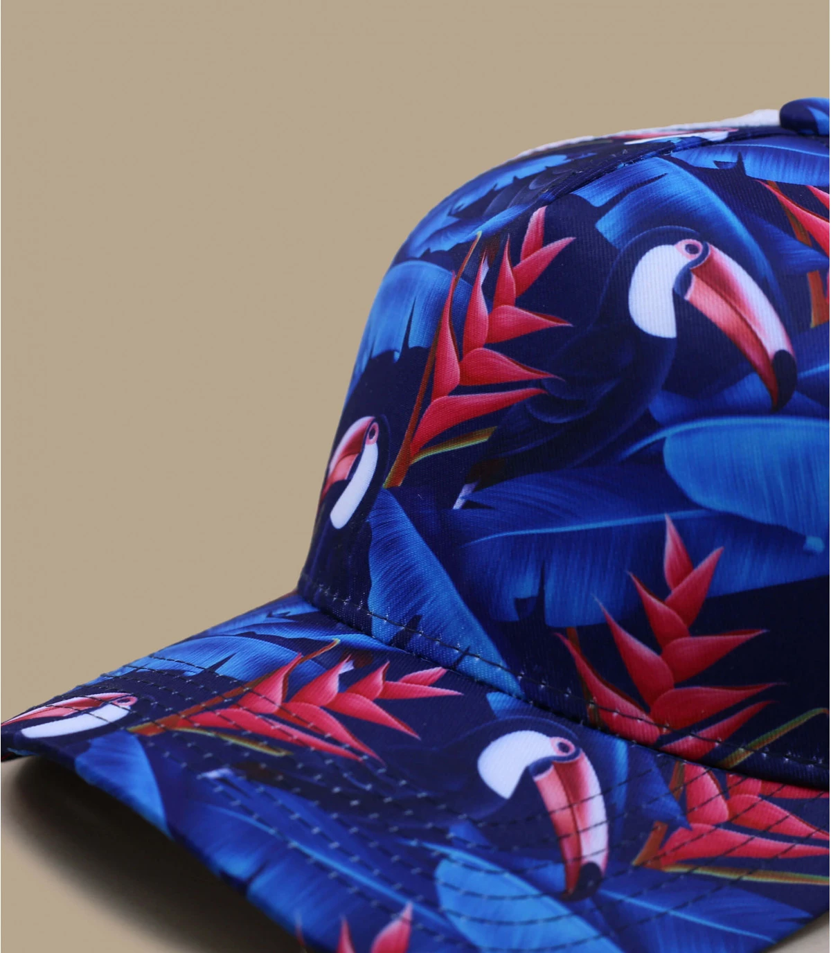 Trucker imprimĂ© Toucan floral devant et visière, filet blanc. Languette de rĂ©glage Ă l’arrière. Tour de tĂŞte 55 Ă 60 cm.